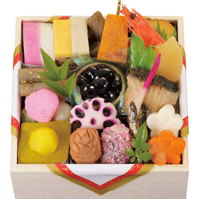 36品・3~4人前の彩り豊かな祝い料理が、二段の重箱に美しく盛り付けられています。