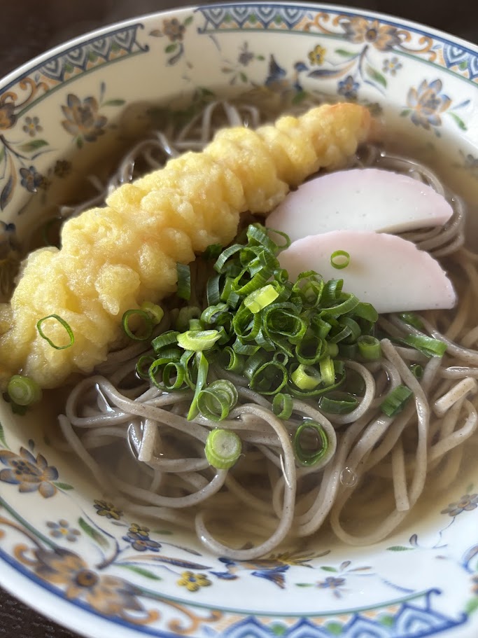 スーパーで買ってきた海老天を載せて、年越しそばとして食べました。あったかくて美味しかったですよ!!!